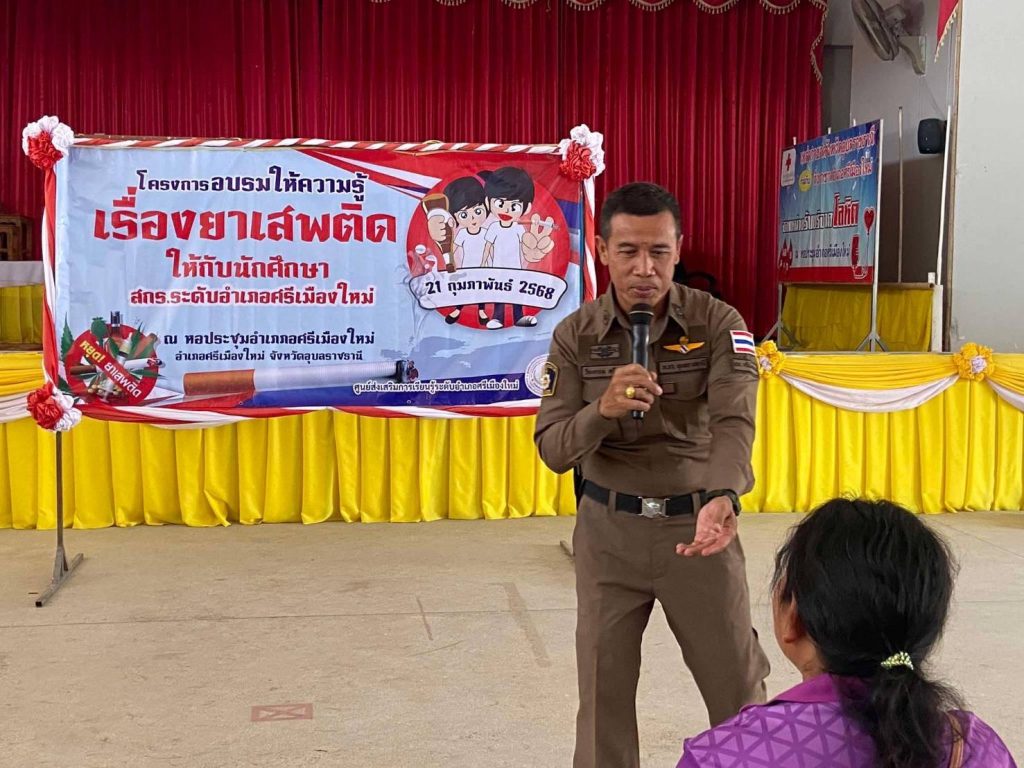 วันที่ 21 ก.พ. 68 เวลา 09.00 น. ร.ต.ท.วีระธรรม ทวีแสง รอง สว.(ป.) สภ.ศรีเมืองใหม่ เป็นวิทยากร ให้ความรู้เกี่ยวกับยาเสพติด โทษและพิษภัยของน้ำกระท่อม บุหรี่ไฟฟ้า ประชาสัมพันธ์การงดเผาเพื่อป้องกันปัญหามลพิษ ฝุ่นละอองขนาดเล็ก PM 2.5 แก่นักศึกษาศูนย์ส่งเสริมการเรียนรู้ระดับอำเภอศรีเมือใหม่ ณ หอประชุมอำเภอศีเมืองใหม่