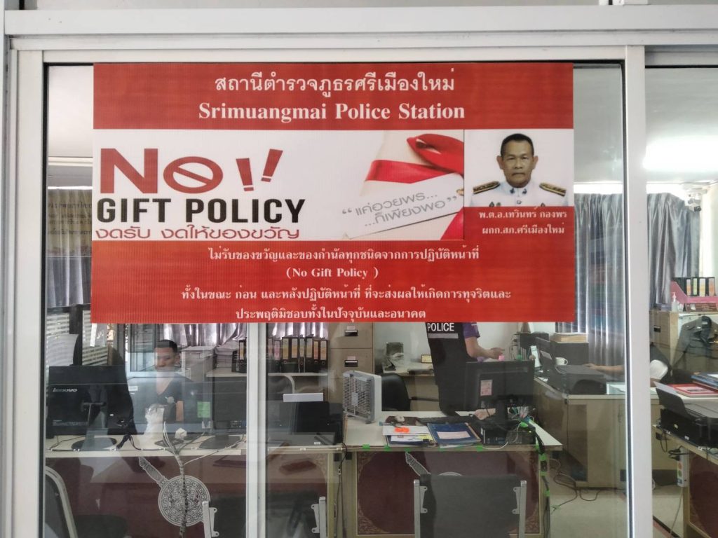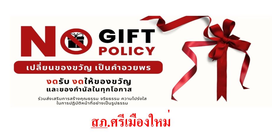 การแสดงอินโฟกราฟิกนโยบายไม่รับของขวัญและของกำนันทุกชนิด (No Gift Policy)จากการปฏิบัติหน้าที่ โดยการติดประกาศ ณ ประตูทางเข้า สภ.และ ห้อง One Stop Service ของ สภ.ศรีเมืองใหม่